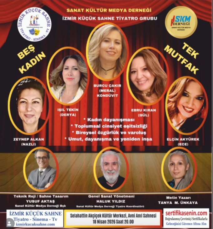 Sanat Kültür Medya Derneği çatısı altında faaliyet gösteren İzmir Küçük Sahne tiyatro ekibi, güçlü anlatımı ve toplumsal mesajlarıyla dikkat çeken “5 Kadın Tek Mutfak” adlı oyunla seyirci karşısına çıkmaya hazırlanıyor.